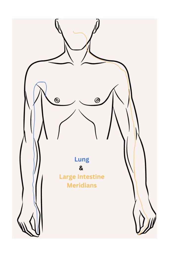 These meridians run from the thumb (Lung) and Index finger (Large intestine), respectively.