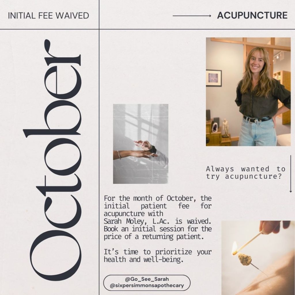 For the month of October you can book an acupuncture initial session for the price of a returning patient session with me at Six Persimmons Apothecary in Boulder, CO.